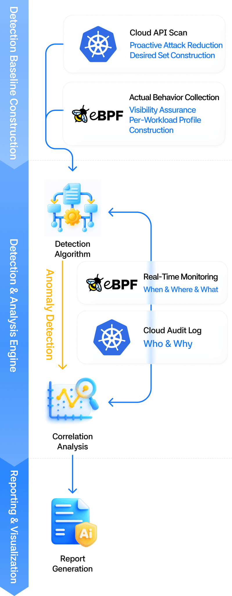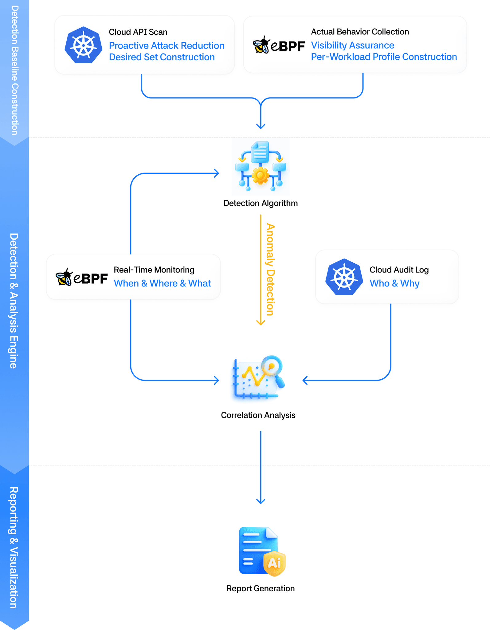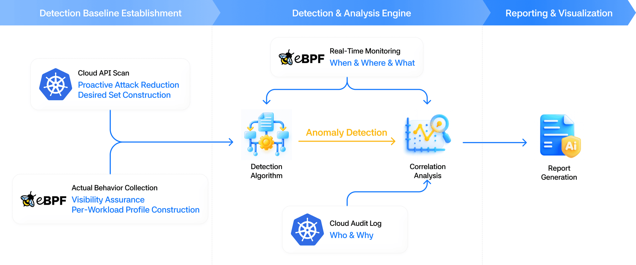 Detects anomalous behavior in real-time by analyzing eBPF event streams without complex rules or signatures.